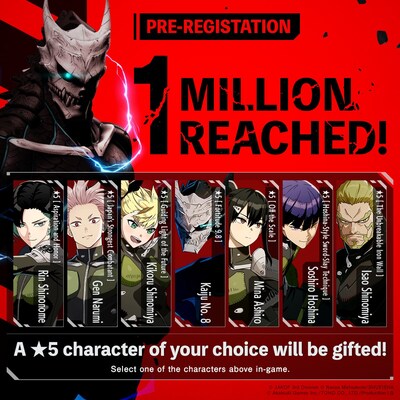View original content to download multimedia:https://www.prnewswire.com/news-releases/kaiju-no-8-the-game-hits-over-one-million-pre-registrations-and-guarantees-a-5-character-of-your-choice-reward-302530811.html